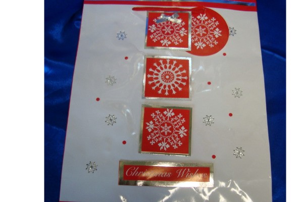 XMAS BAG WITH RED DETAIL ON THE FRONT AND WHITE SNOWFLAKE Lg Xmas Gift Bag 33x26cm SKU: XGBET1552 Login to see the prices Description XMAS BAG WHITE SNOW FLAKE BACKGROUND AND RED DETAIL ON THE FRONT